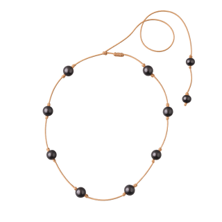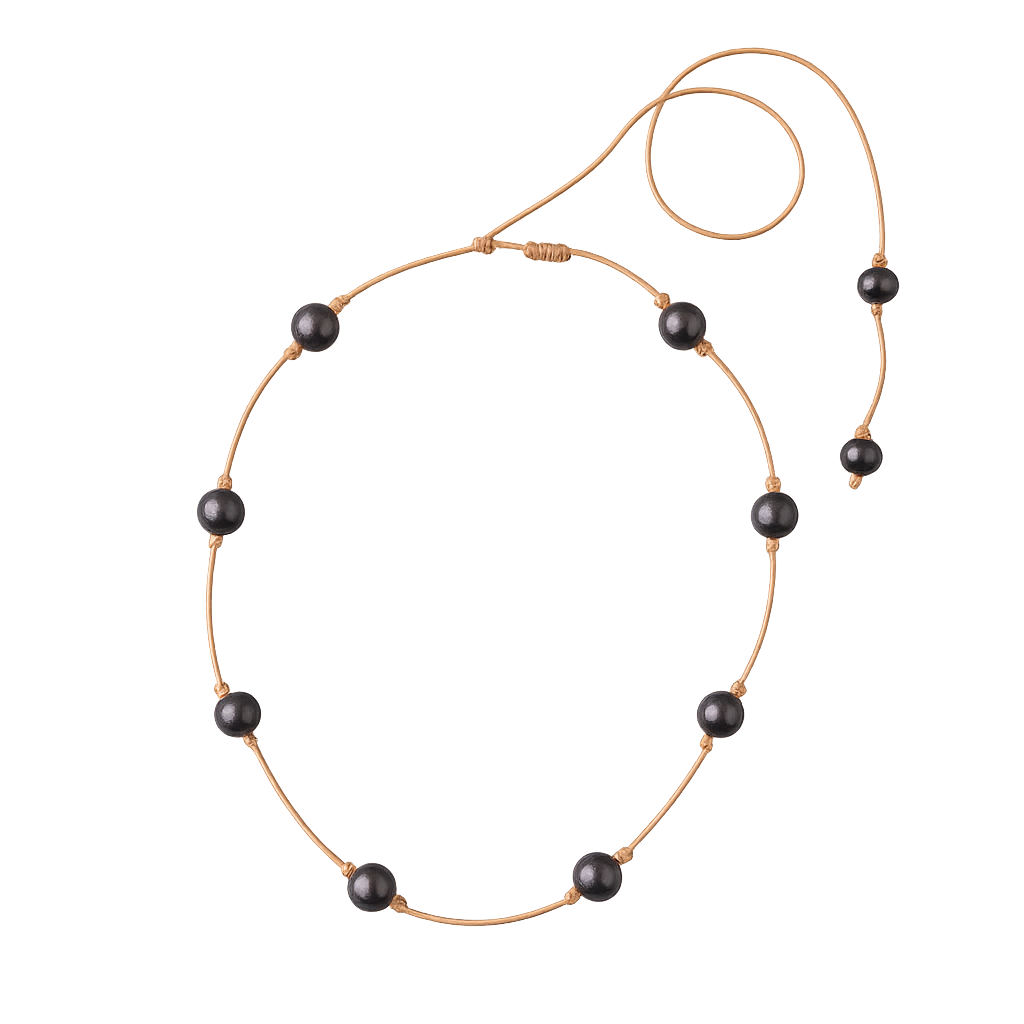 A simple line of deep black pearls floats along a soft, natural cord, creating a necklace that feels effortless and modern. Each pearl is individually knotted, allowing gentle movement and an organic rhythm as it rests against the skin.