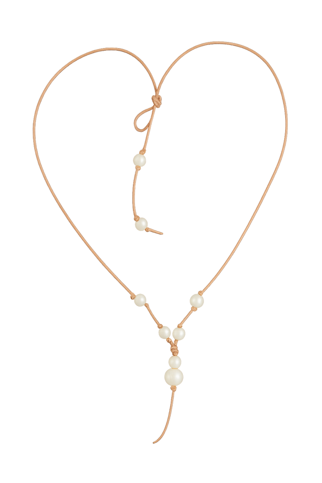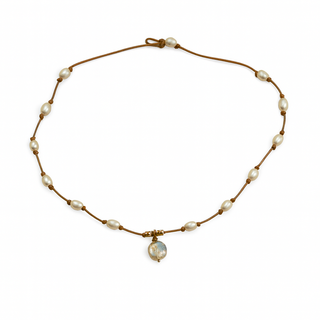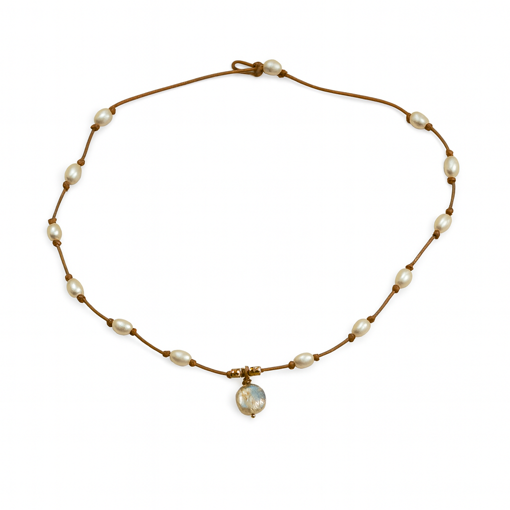 The Moon Drop Necklace blends softly spaced freshwater pearls with a delicate central pendant that catches the light like a reflection on water. Hand-knotted on natural leather cord, the design feels balanced and fluid, with just enough movement to draw the eye.