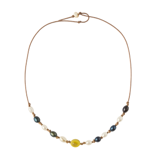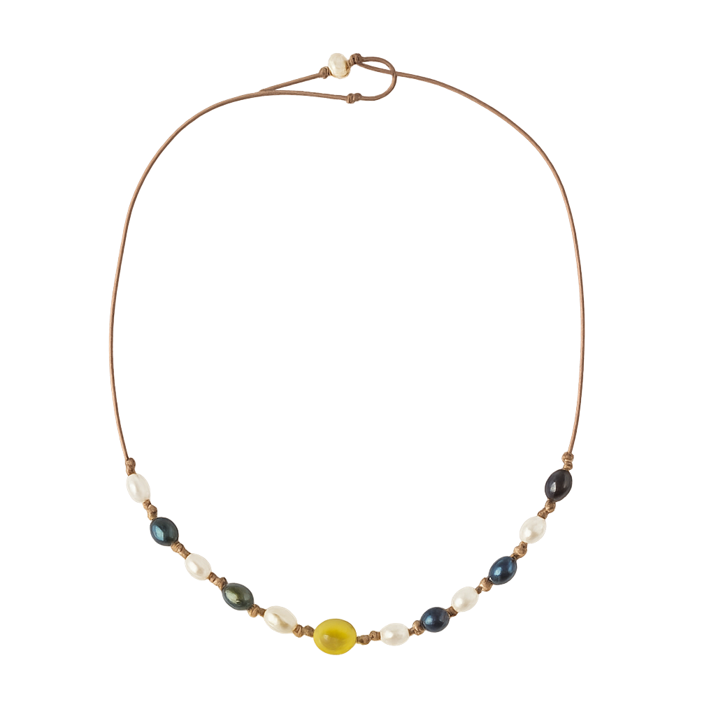 Stillwater Necklace, captures the quiet beauty where fresh water meets the sea. Hand-knotted on natural leather cord, this piece blends luminous white pearls, deep peacock pearls, and a soft golden stone centerpiece that feels sun-warmed and organic. Effortless and understated, it’s designed to rest close to the skin—perfect alone or layered.