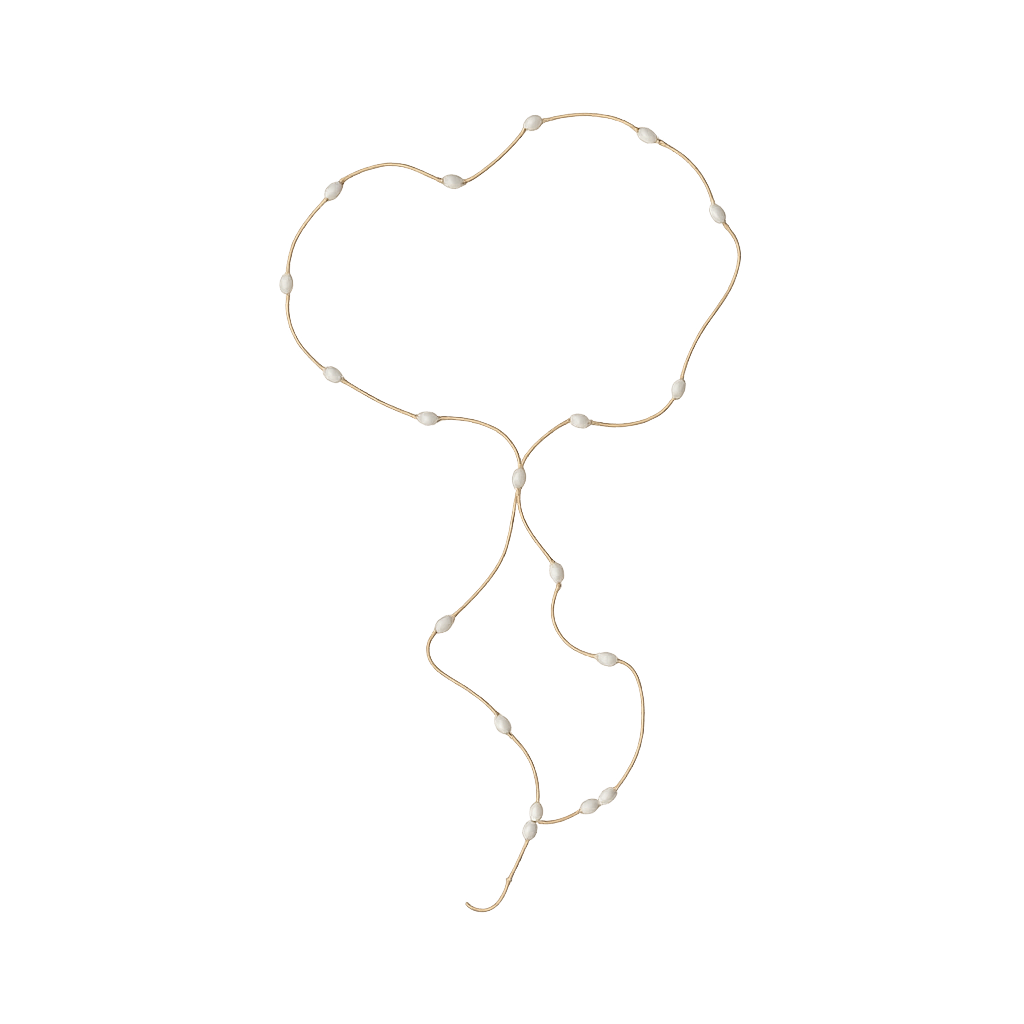 Designed without a fixed clasp, the lariat style allows the necklace to be worn multiple ways—high and close to the collarbone, loosely layered, or dramatically elongated with the trailing ends cascading down the front. Each pearl is intentionally spaced, allowing light to move between them and giving the necklace an organic, almost tidal rhythm.