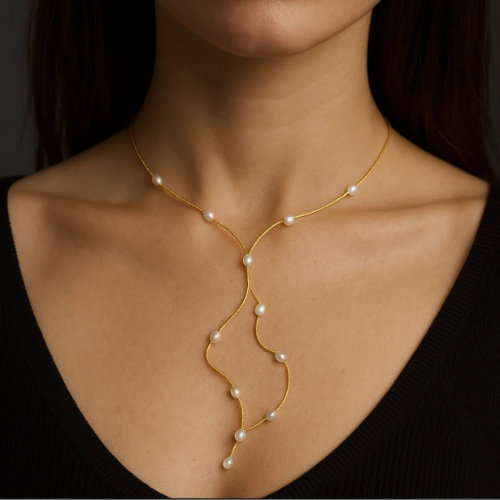 Stillwater Necklace, captures the quiet beauty where fresh water meets the sea. Hand-knotted on natural leather cord, this piece blends luminous white pearls, deep peacock pearls, and a soft golden stone centerpiece that feels sun-warmed and organic. Effortless and understated, it’s designed to rest close to the skin—perfect alone or layered.
