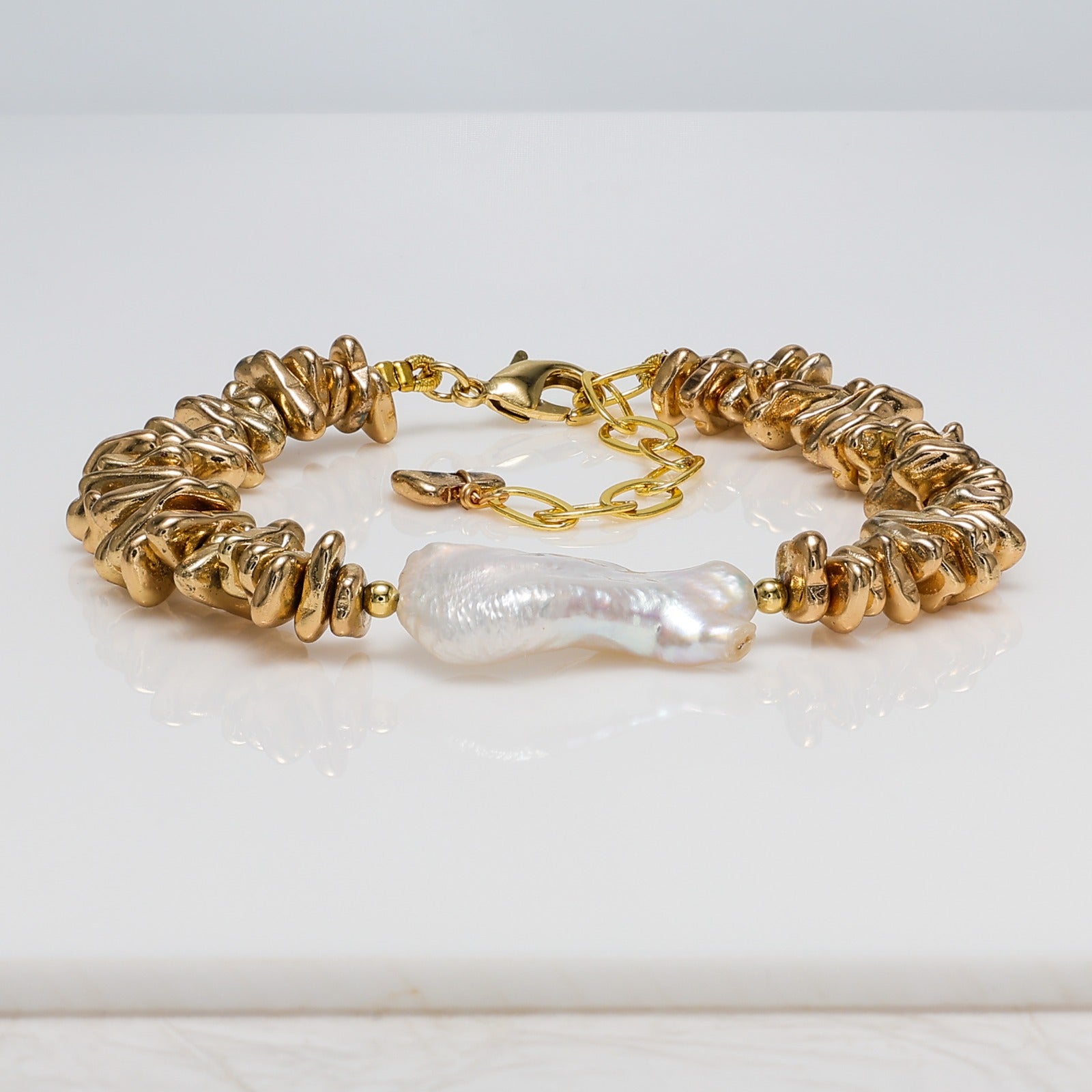 Bold yet refined, this statement bracelet features a luminous baroque freshwater pearl centerpiece framed by smooth, gold-plated hematite beads. The sculptural hematite chips add weight, shine, and modern texture, while the organic pearl brings a soft, iridescent contrast—creating a striking balance of strength and elegance.