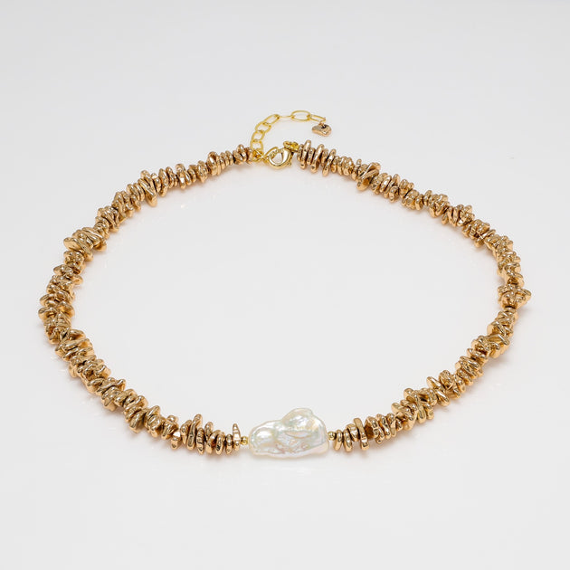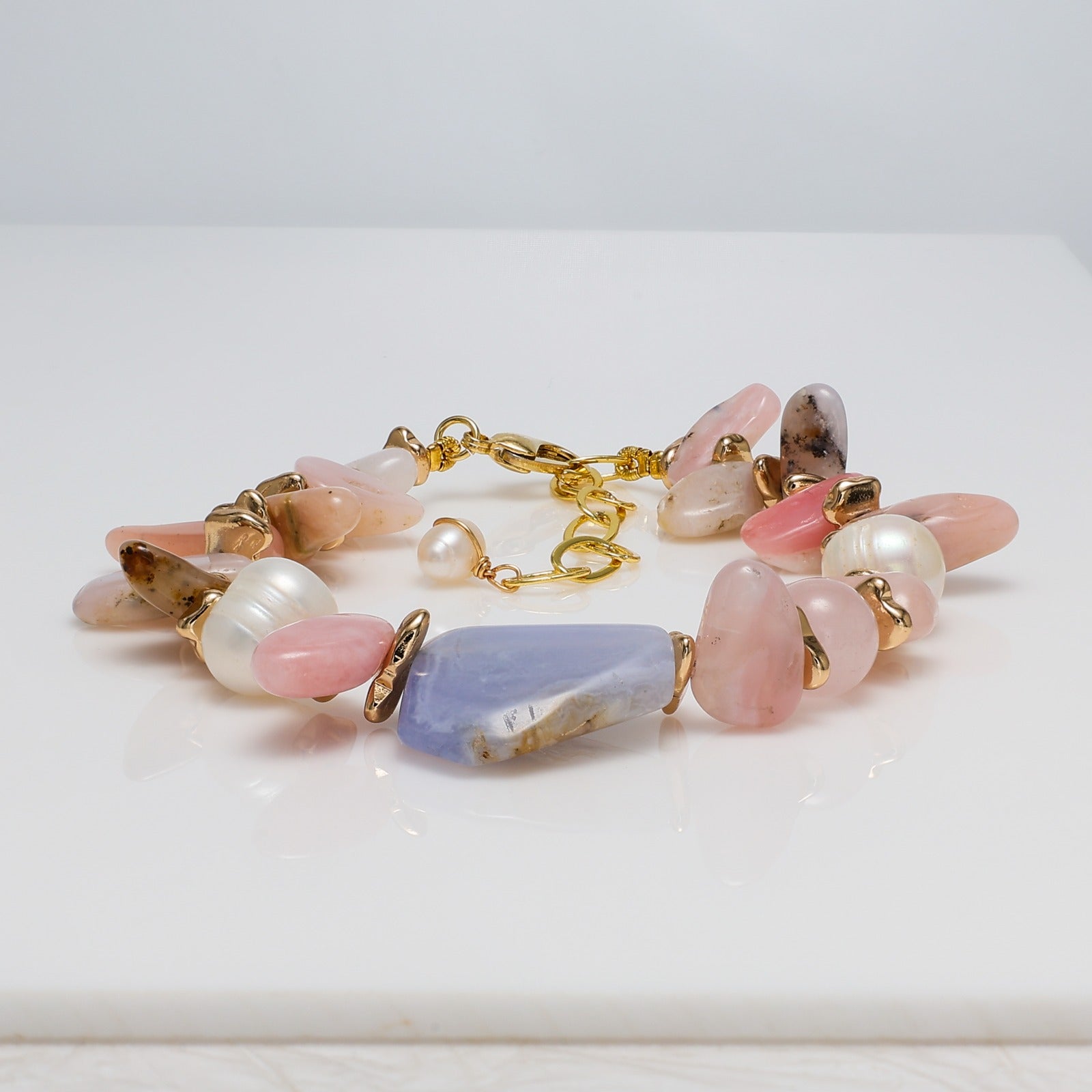 Soft, organic, and beautifully balanced, this bracelet blends natural gemstones and freshwater pearls into a refined statement piece inspired by earth and sea. At the center, a smooth blue lace agate stone anchors the design, surrounded by blush-toned gemstones, luminous pearls, and warm gold-tone accents.