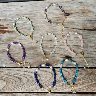 30 Assorted Gemstone Bracelets. Amethyst, Apatite, Rose Quartz, Amazonite and clear quartz strung on 18 k Gold plated findings.