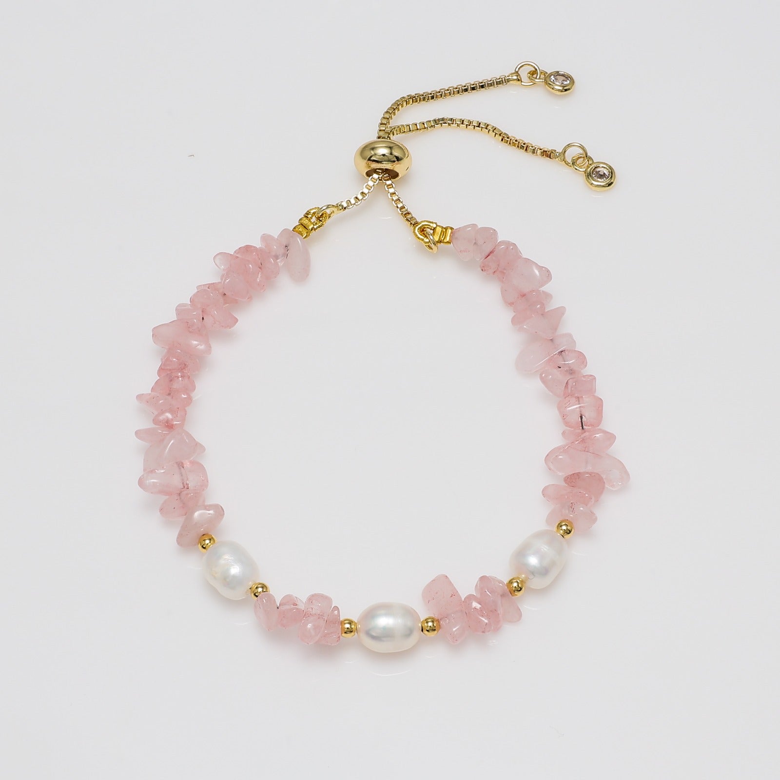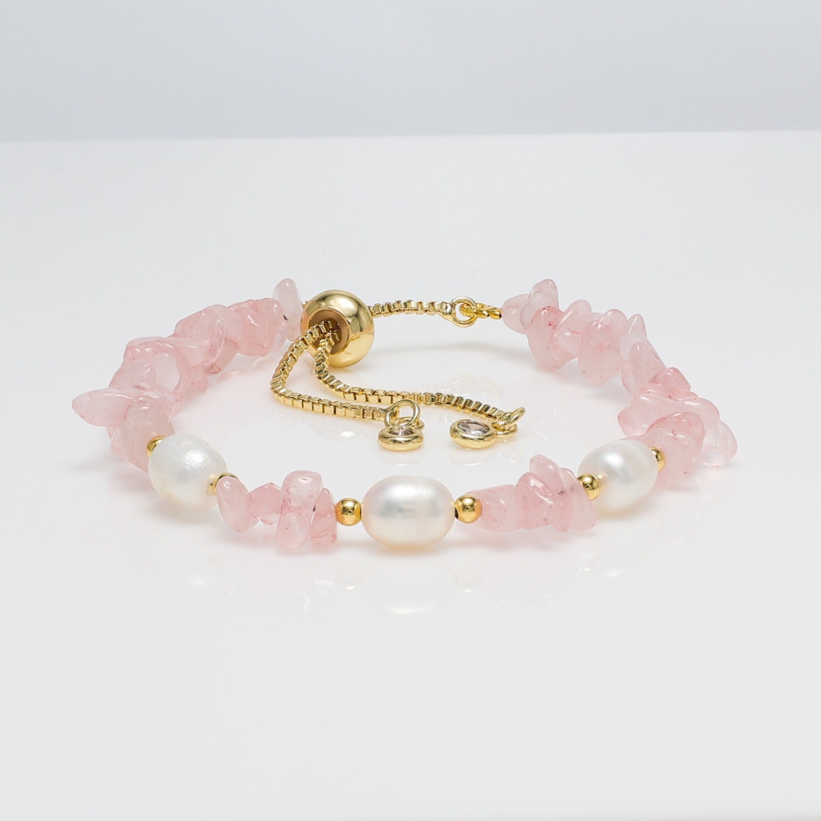 Soft, elegant, and beautifully feminine — this Rose Quartz & Pearl adjustable bracelet is all about grace and gentle beauty. Handcrafted with natural rose quartz chips in delicate shades of blush pink, it features luminous freshwater pearls and warm gold accents for a refined finish.