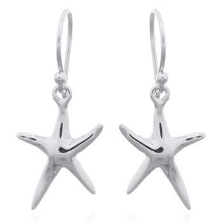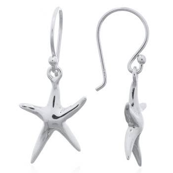 Small and minimalistic Sterling Silver starfish Dangle earrings. These starfish earrings are dainty, with irregular long five rays or arms that are tapered towards the ends. The slightly convexed center generates an abundant shine on the high polished Hallmarked 925 Sterling Silver shapes that reflect and mirror the surround fabulously. Simple and small silver earrings that add a dash of silver to the features and dangle on swing loops.