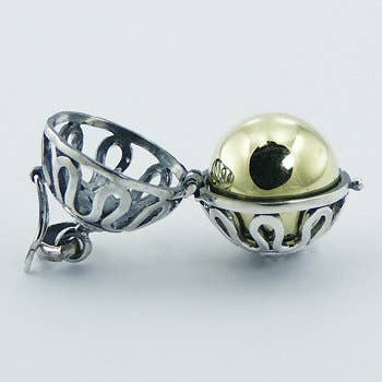 Delightful designer Harmony Ball pendant features the open, high polished 925 Sterling Silver sphere adorned with a flowing wavy line and at top and bottom with beaded circular borders that are composed of tiny silver spheres on an oxidized background, creating a delicious contrast. The golden shining, high polished brass ball shines through the casing and produces a sweet sound when a woman moves, which has a relaxing and stress releasing effect. A wonderful brass silver jewelry that appeals to women that love rich and romantic replicas of antique designs. Harmony Ball pendants are also know as Chiming Sphere pendants for the sound they produce.